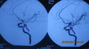患者韦某某,女性,58岁,因“突发头痛头晕10小时”于2014年2月13日急诊入科,入院CT检查提示:自发性蛛网膜下腔出血。医生给予患者做全脑血管造影(DSA)提示:左侧颈内动脉后交通动脉瘤,大小约(3.0~4.0mm),并行动脉瘤血管内介入栓塞治疗,手术过程顺利,术后患者恢复良好,无神经功能障碍。