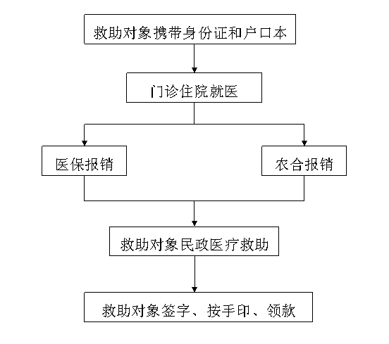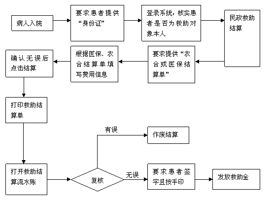 2.假如患者是民政救助对象,则持相关医疗费用发票、医保或农合报销单据,到民政救助窗口办理补助结算,系统会根据患者提供的身份证号进行核对判断是否为救助对象。确认为救助对象的给予报销;否则不给予报销。